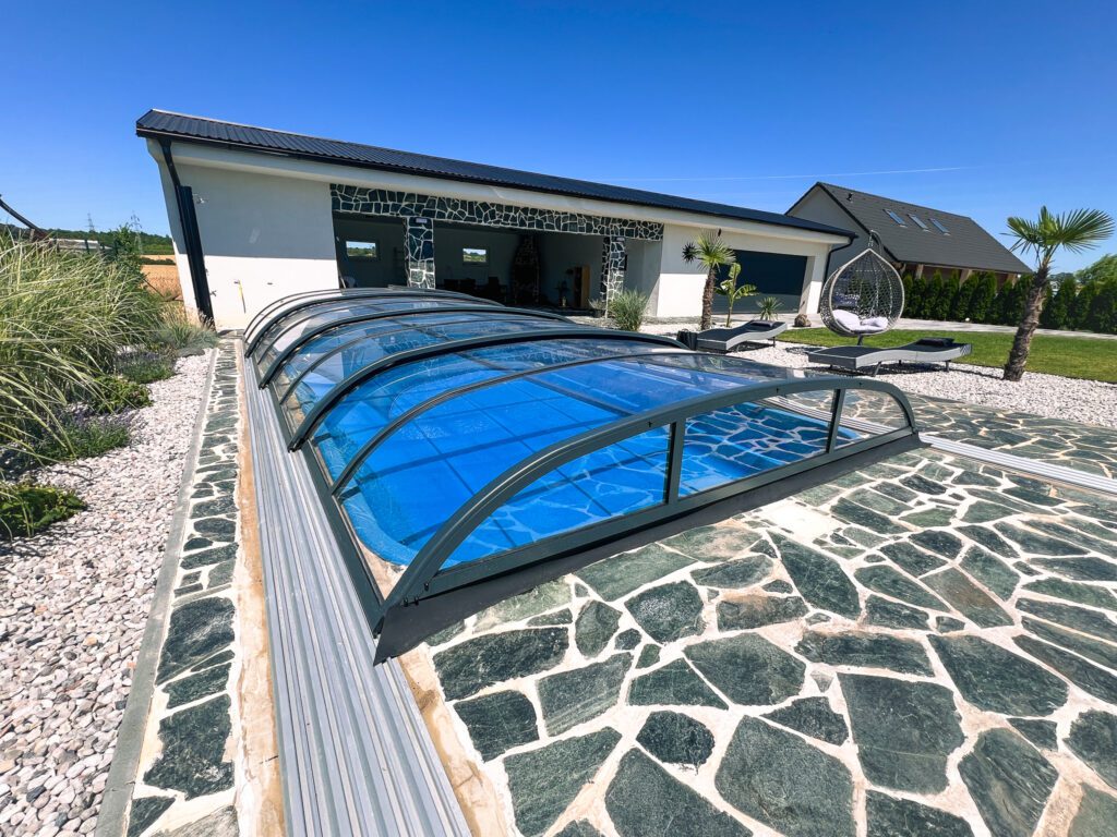 A proč vysoké zastřešení? Pod vysokým zastřešením se nemusíte krčit. K bazénu přijdete oblečení a pod vyhřátým zastřešením se v klidu svlečete do plavek a můžete jít plavat do teplé vody. Po plavání se zase v teple obléknete do oblečení a přejdete do domu.