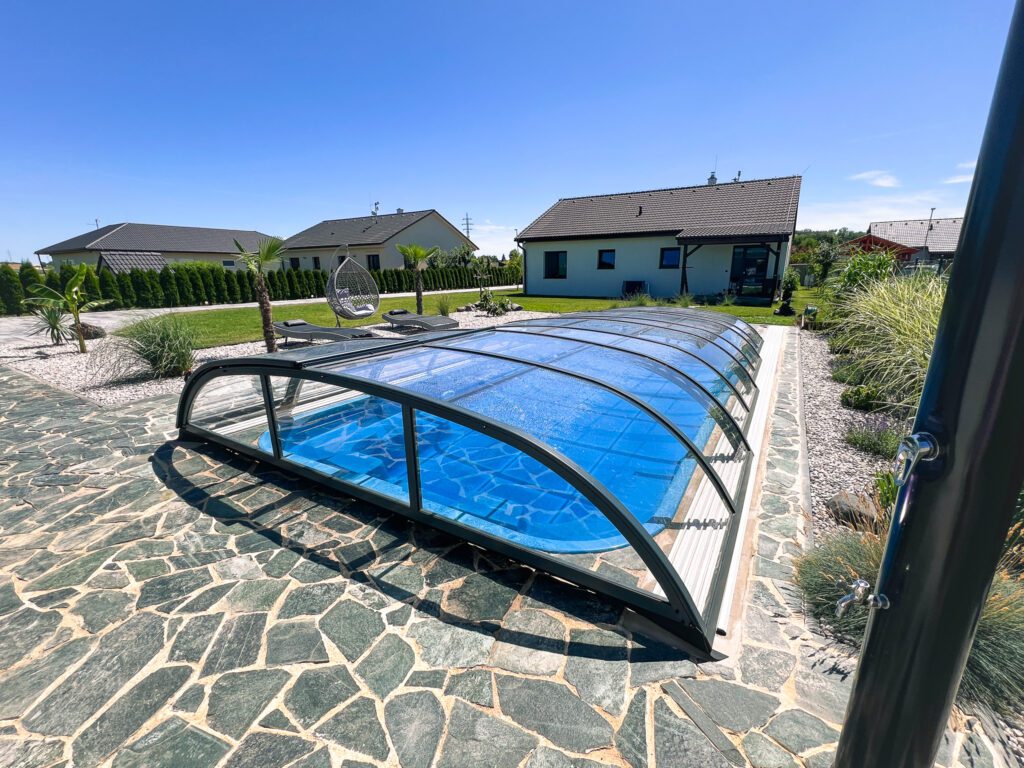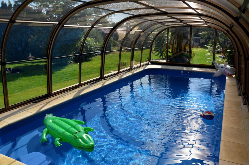 Na druhou stranu jde o cenově nejdostupnější variantu celoročního zastřešení bazénu a když se uskromníte, zvládnete se pod krytem i svléknout do plavek.