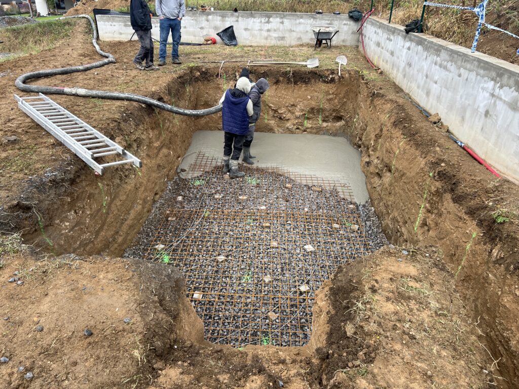Laminátový bazén má také minimální nároky na základovou desku. Díky své odolnosti si vystačí s 10cm vrstvou betonu s jednou kari sítí, beton navíc nemusí být úplně vyhlazený. Jenom ho nahrubo srovnáte, tzv. strhnete, pomocí prkna nebo lišty. Základy pro bazén vám za jeden nebo dva dny vykope jakákoliv firma s malým bagrem, případně parta brigádníků či kamarádů.