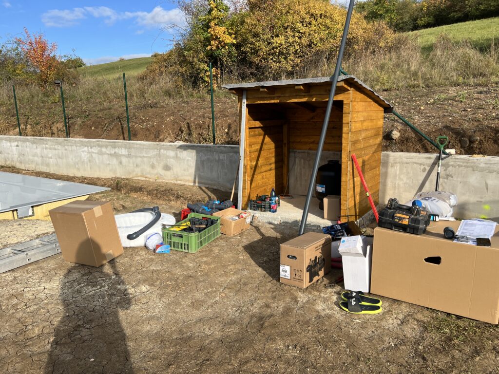 Oproti tomu naše laminátové bazény mají izolaci již zabudovanou. Stačí tedy pouze napouštět vodu do bazénu a současně lopatou bazén zasypávat betonovou směsí.